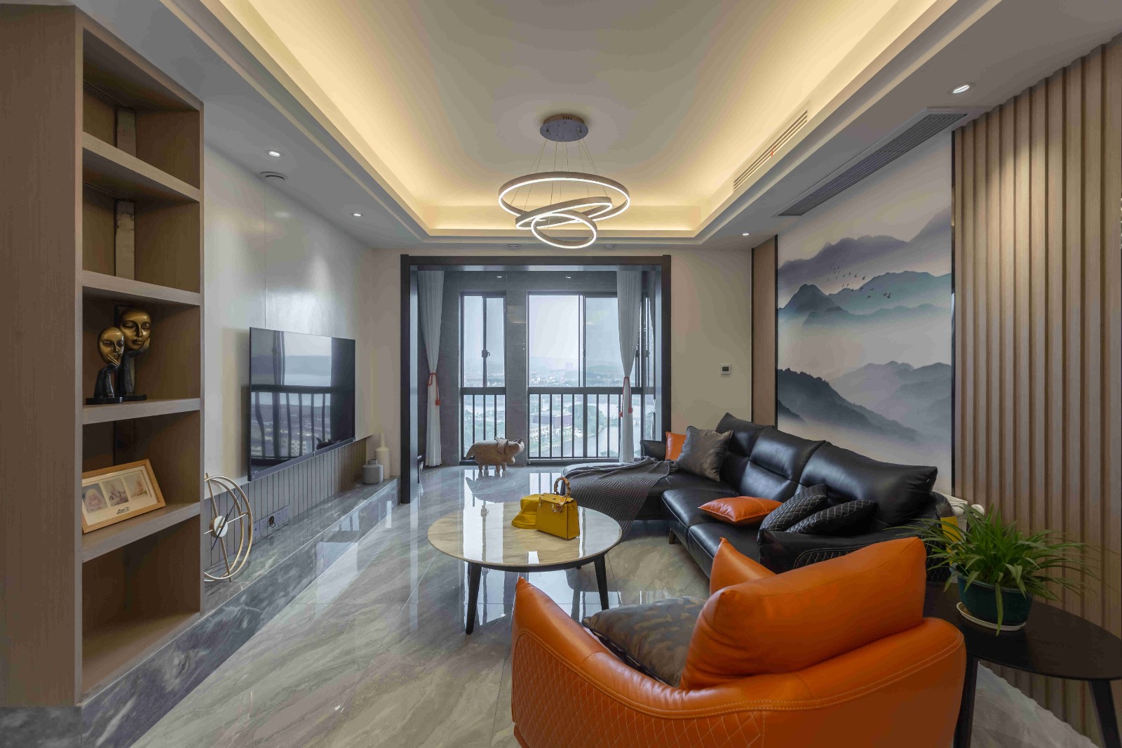 橙色單人皮質(zhì)沙發(fā),造型獨(dú)特的工藝吊燈,電視墻左側(cè)佇立的木柜,都為客廳的灰藍(lán)白色調(diào)增添了色彩。