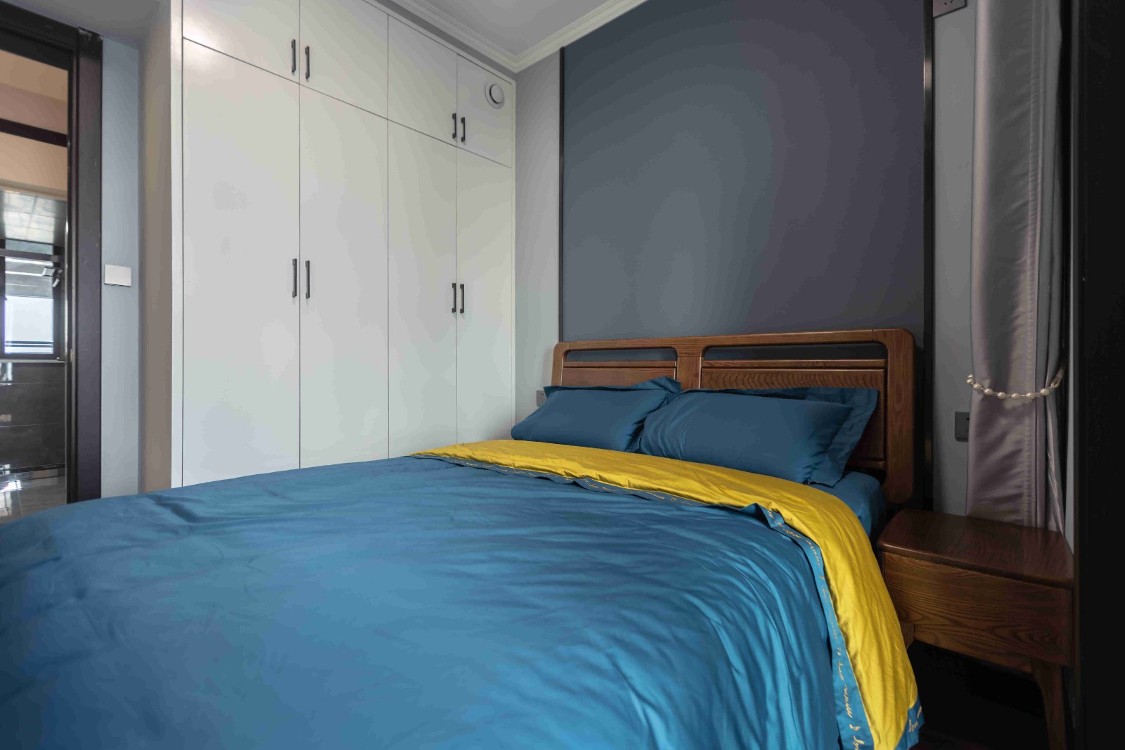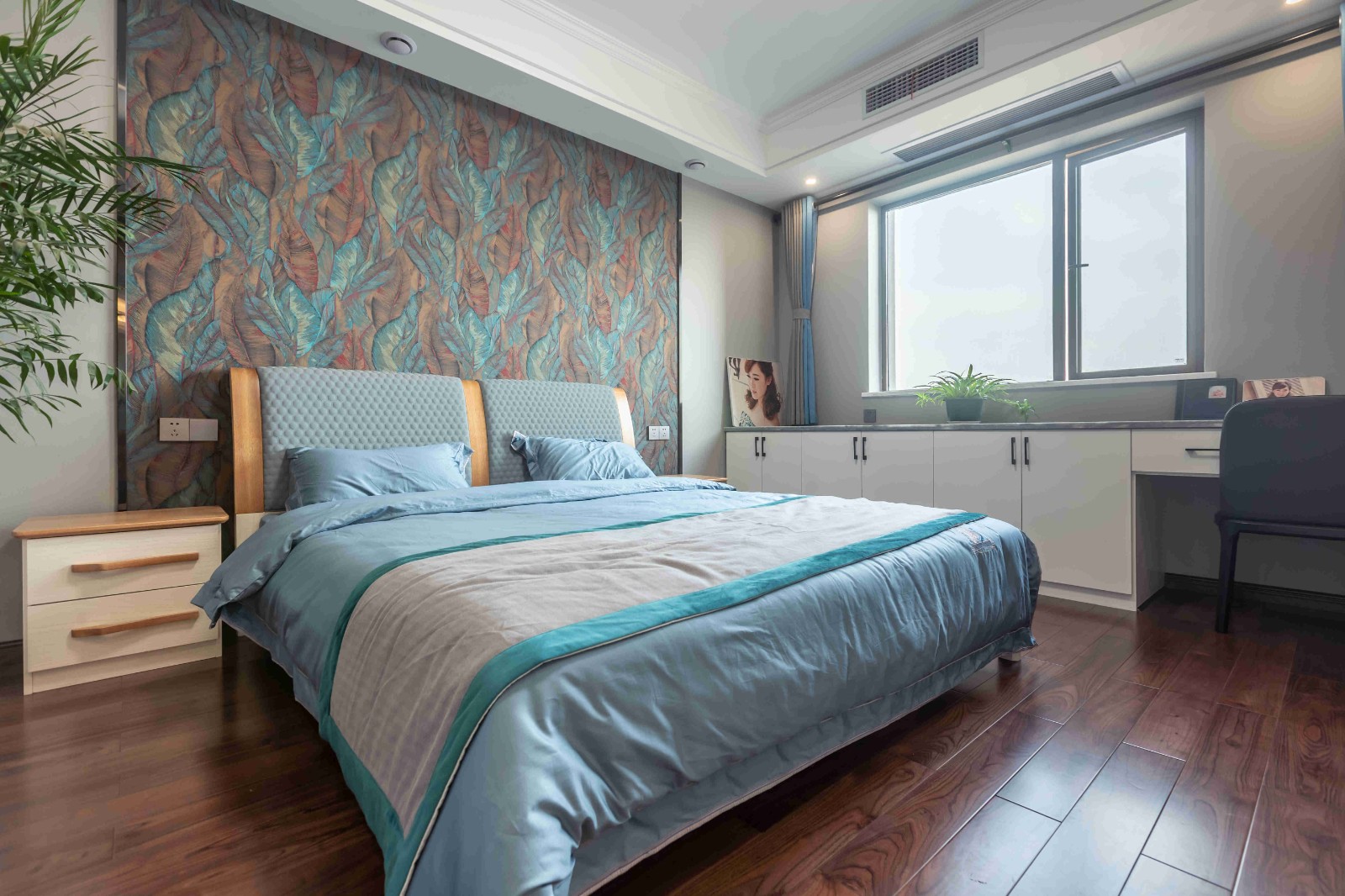 在原戶型的基礎(chǔ)上,并沒有做太多的改動(dòng)。靠窗增加了一排定制柜子,既能做梳妝臺(tái)又能放置東西。最引人注目的是床頭背景墻,充滿了藝術(shù)氣息,深邃幽遠(yuǎn)。
