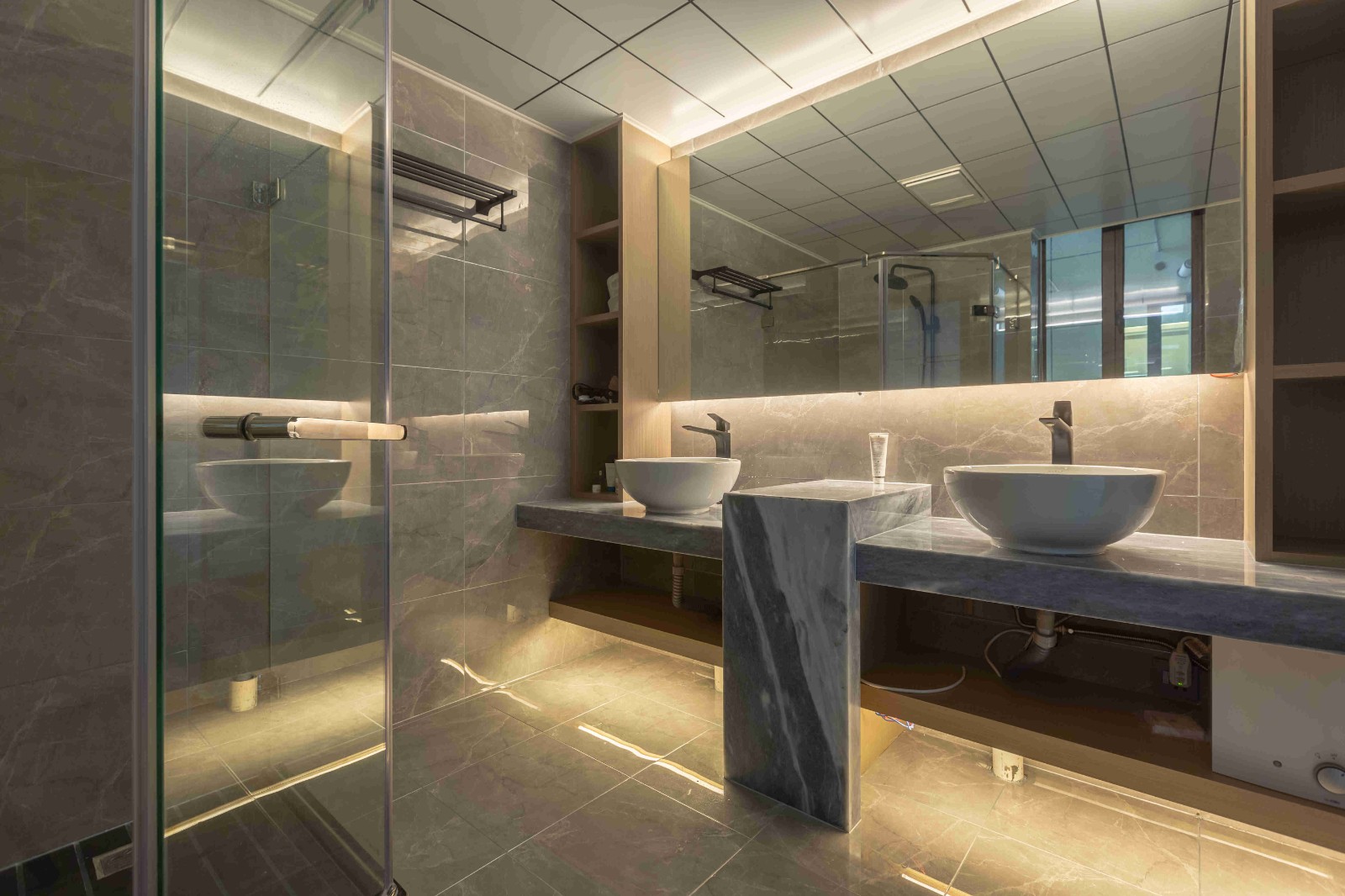 灰色大理石瓷磚和洗手臺(tái),兩個(gè)洗手池,巨大的鏡子,后面藏著隱藏的燈管,簡潔大氣。