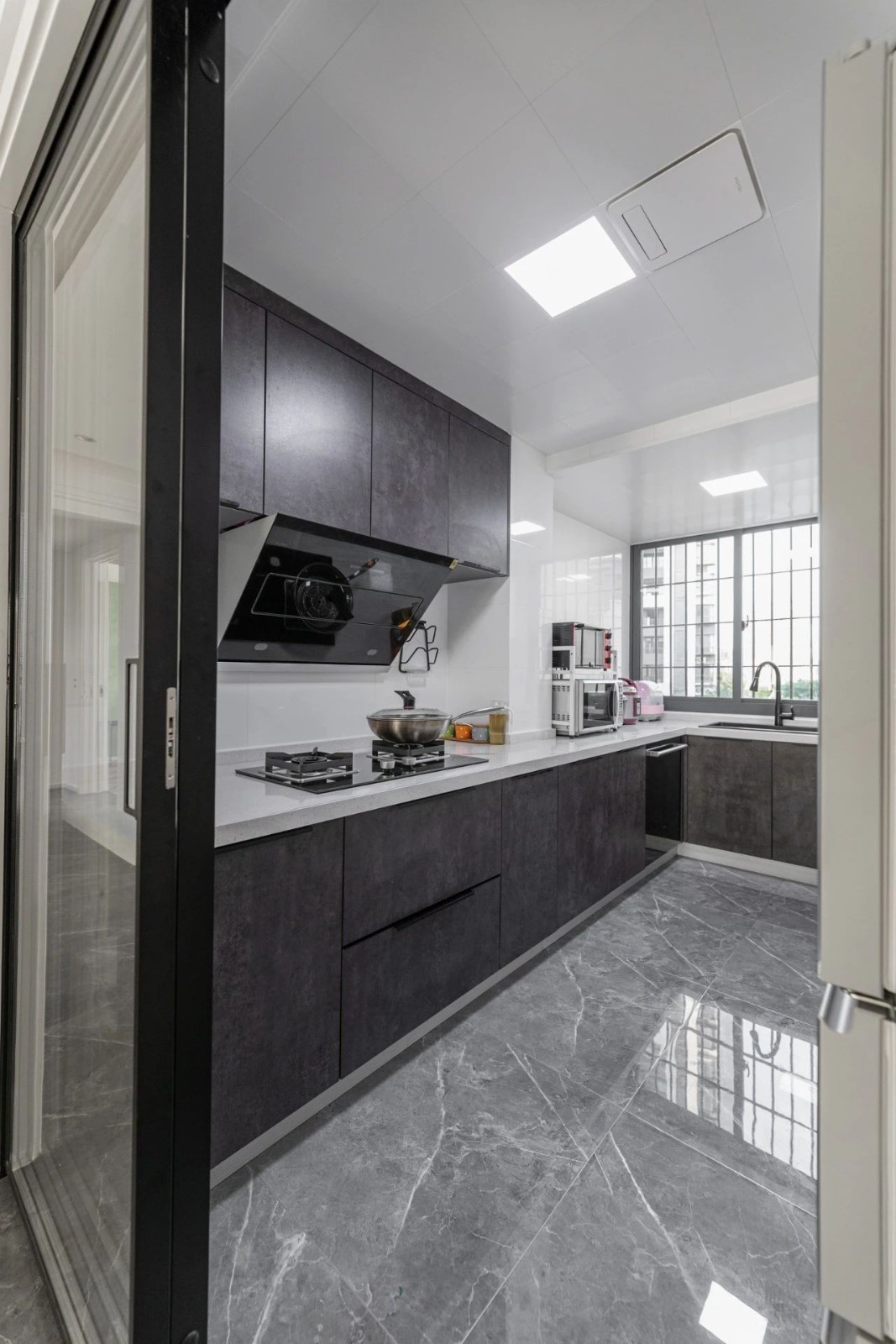 廚房的深色設(shè)計,仿佛沉淀了所有煙火氣,玻璃移門讓空間更加通透明亮,也能看到孩子在客廳的活動狀態(tài)。