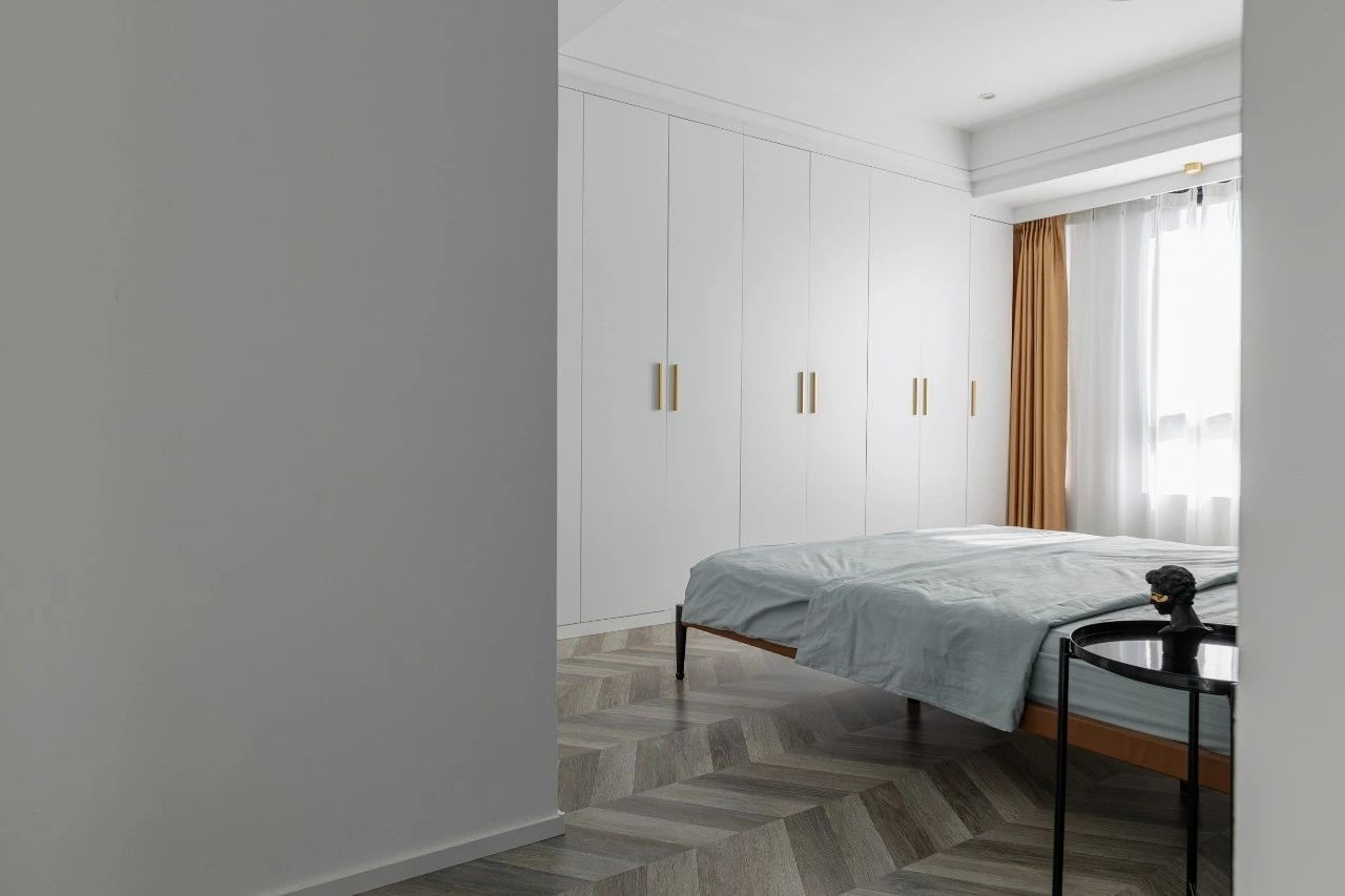 主臥的設(shè)計也延用了公共空間的配色,墨綠色作為床頭背景色,搭配黃色的皮革床,營造出低調(diào)高雅的氣質(zhì)。