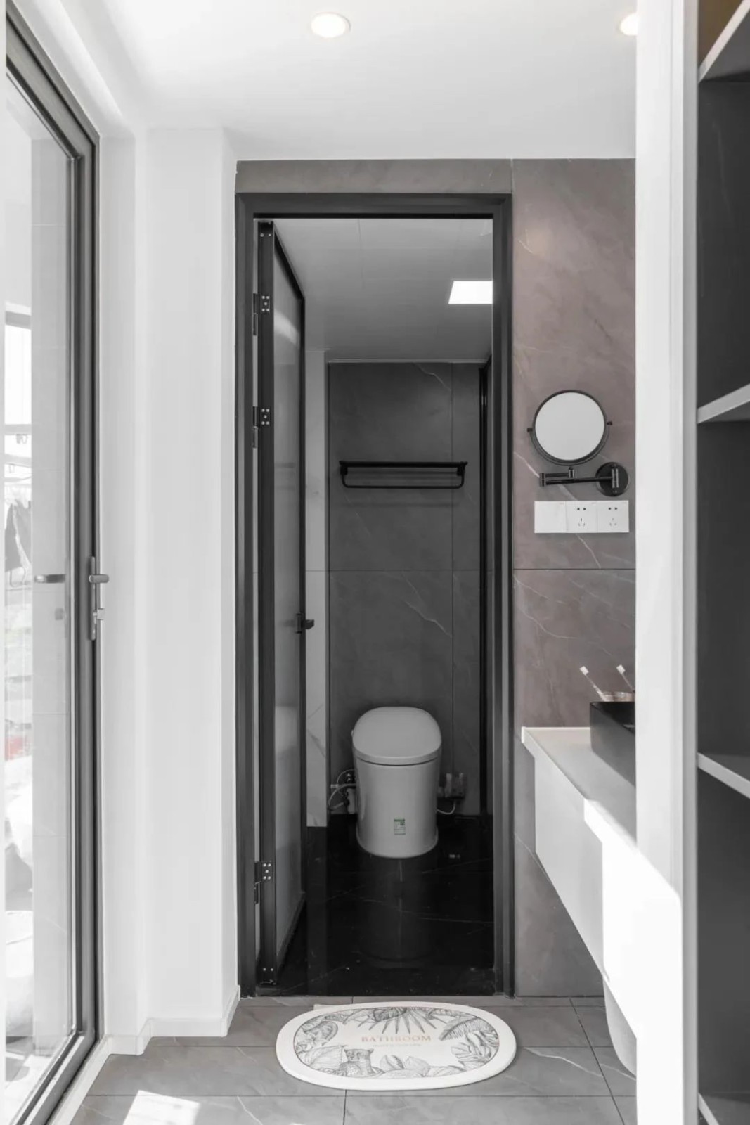 衛(wèi)生間與小陽臺之間用玻璃門分隔,增加暗衛(wèi)的采光和通透性。